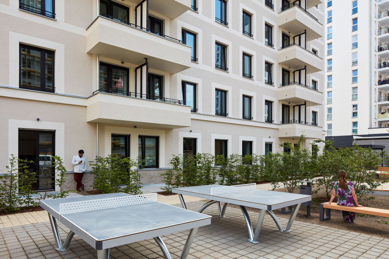 Densification has proved an effective tool for dealing with the impacts of population growth in Berlin, and the comparatively generous large-scale developments in the East German modernist style are increasingly coming under pressure. On Marchwitzastrasse, a more than fifty years old ribbon development is now being augmented by new residential high-rises and a supermarket as well as a refuge for people in need. We consider ourselves privileged to be able, within the financial scope defined by the client, to build for people in need and provide them with a safe place of high architectural quality. Since length of stay varies widely, the eight-storey residential building is legally registered as a boarding house. It is serviced around the clock. Some of the small apartments can be linked to shelter an entire family. Shared kitchens, lounges, and hobby rooms provide a social dimension giving inhabitants a sense of security at a time of personal emergency.